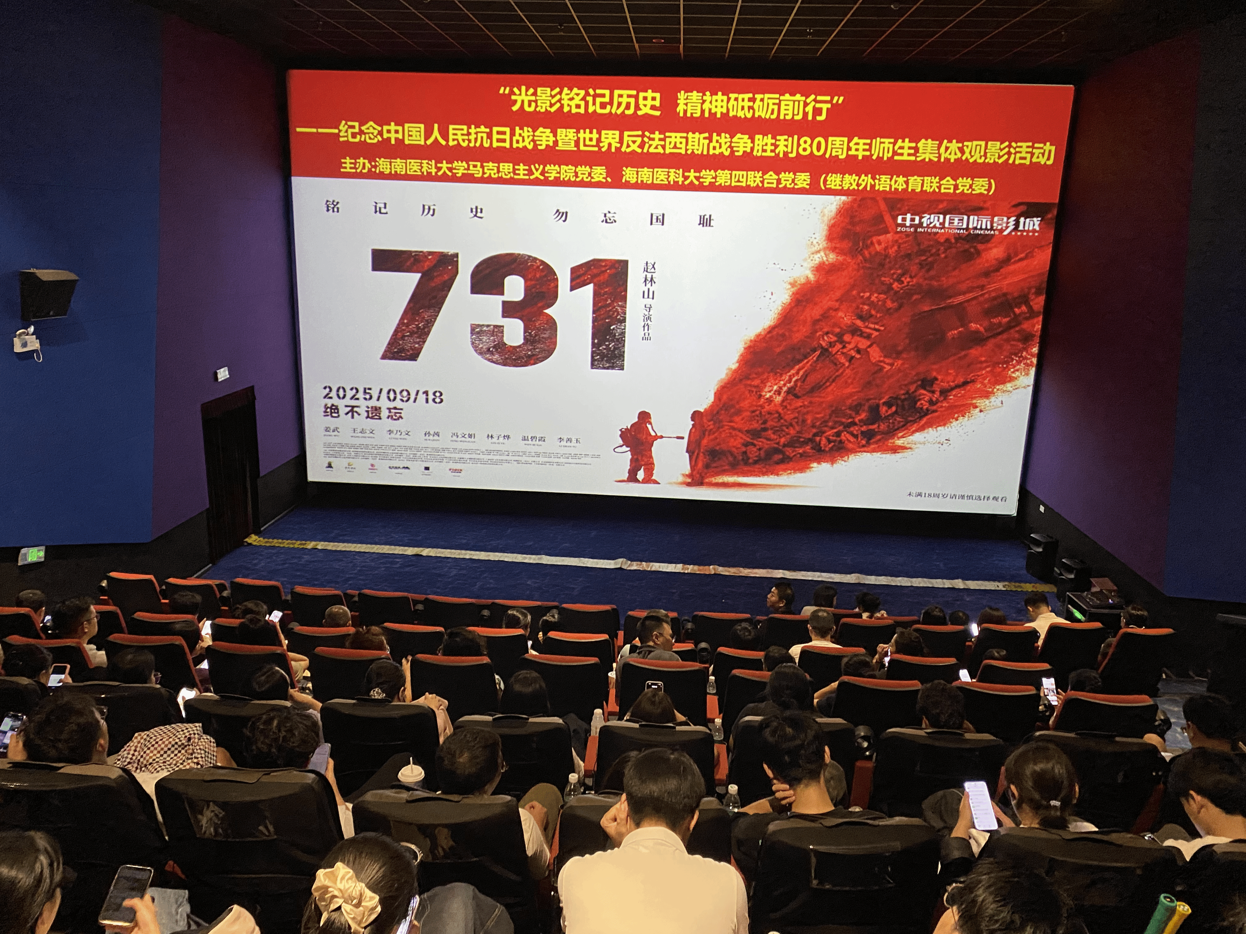 2025年9月18日,在“九一八”事变纪念日这一特殊时刻,海南医科大学第四联合党委与马克思主义学院党委联合开展主题教育活动,组织全体党员及师生代表集中观看红色主题电影《731》。第四联合党委书记常彩红、体育部主任陈基成、马克思主义学院党委书记王身坚、院长周书俊出席活动,继续教育学院、马克思主义学院、外语部、体育部的教职工及研究生代表共120余人参加观影,共同在光影中重温革命历史,感悟初心使命。