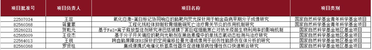 8月底,国家自然科学基金委员会公布了2025年度国家自然科学基金集中接收申请项目评审结果。我校功能材料与分子影像技术创新团队在本年度共申报各类项目18项,成功获批6项,立项率达33.3%。