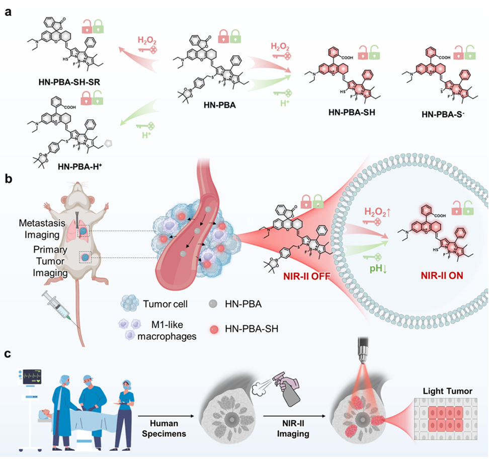 近期,团队青年教师窦昆在高水平期刊《Angewandte Chemie International Edition》(德国应用化学)上发表重要成果:一种可被肿瘤相关H2O2和微酸性环境协同激活的近红外二区影像探针HN-PBA,并用于高对比度肿瘤成像及荧光引导手术导航的研究。与传统的“始终开启”探针及单一H2O2激活探针相比,这种双重响应机制可减少假阳性信号干扰,有助于更准确地识别肿瘤并切除原发性和转移性肿瘤。更值得关注的是,这种探针可有效检测直径≤0.7mm的肺转移灶,并在临床乳腺癌标本中展示了精确区分病变及正常组织的能力。