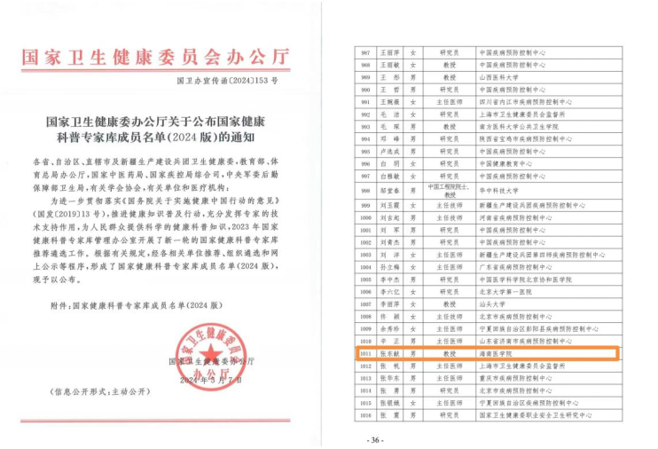 近日,国家卫生健康委员会发布国家健康科普专家库成员名单(2024版),我校张东献教授入选。