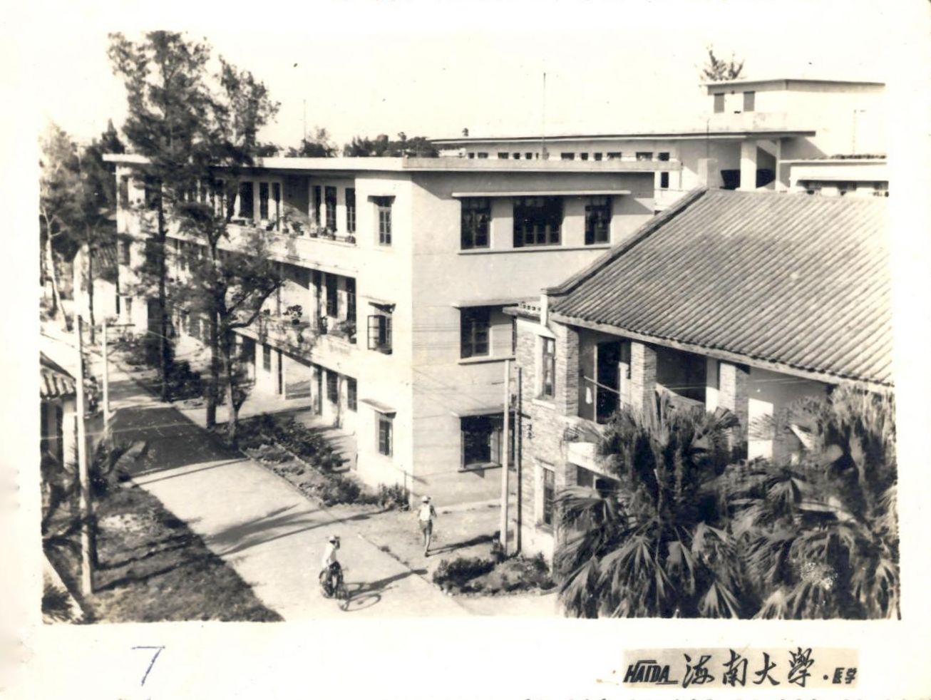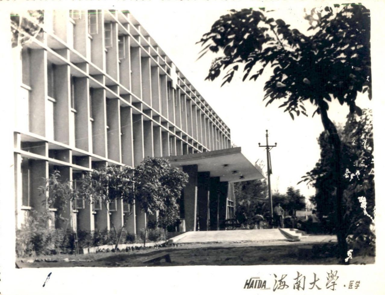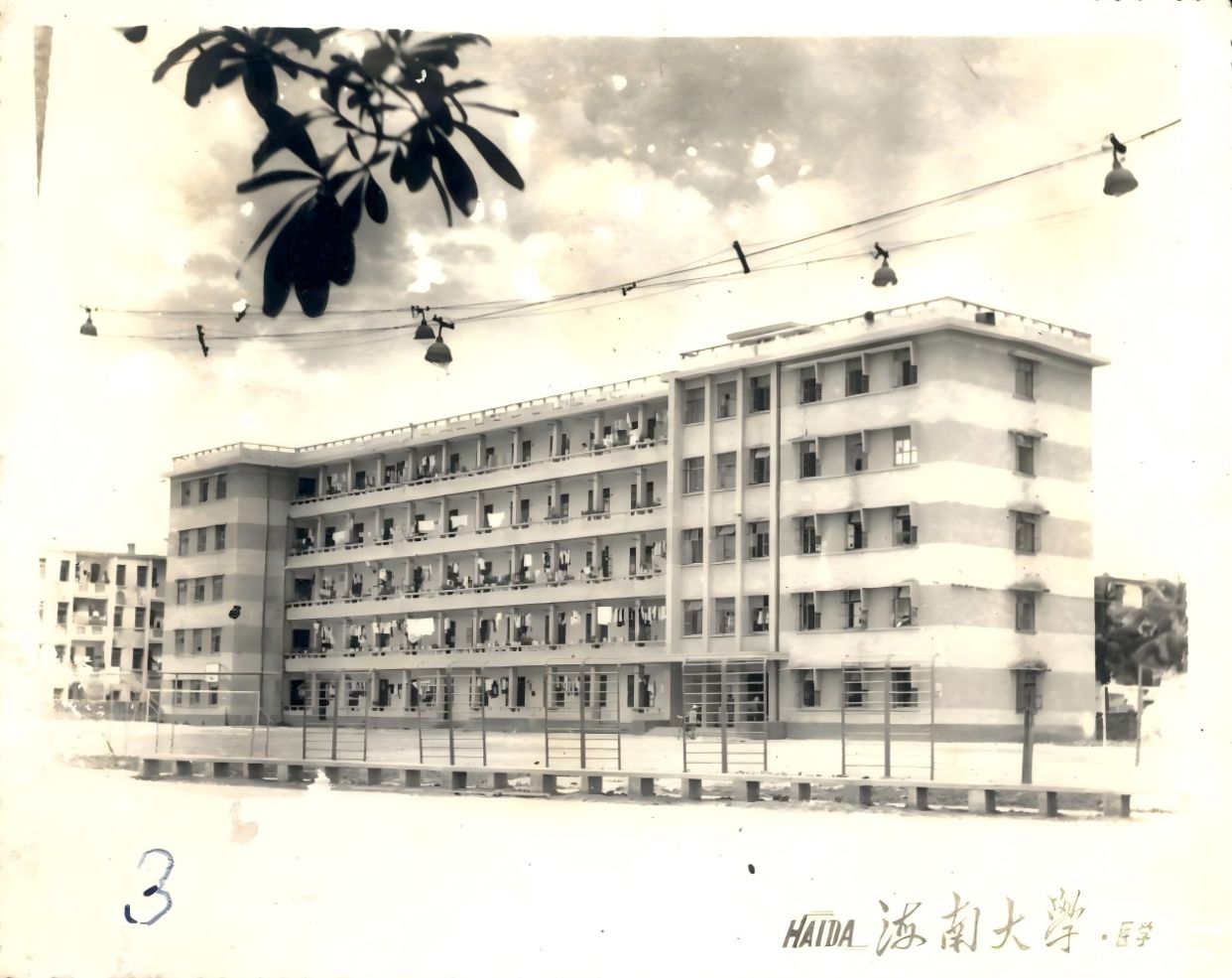 此次捐赠的照片,右下角均书写着“HAIDA 海南大学·医学”字样,清晰记录了医学部时期的学生公寓楼、外科楼等多个建筑的风貌。其中一张照片尤为珍贵,捕捉到了悬挂临时门牌的海南医专门楼,尽管照片上铁质门牌上的横书字迹略显模糊,但经初步判断,很可能正是“海南大学医学部”字样。这与先前校友们发现的校门照片形成了有力的互证,极大地丰富了此历史阶段的校园记忆。