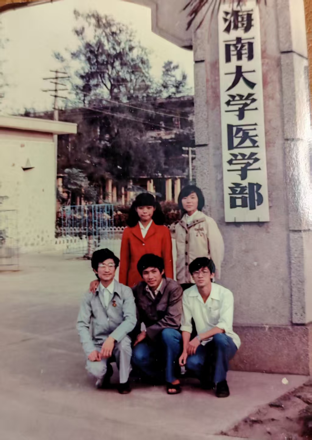 倡议发出的当晚(10月20日凌晨),李敏校友便率先传来喜讯,他在个人相册中找到了首张关键照片——五名学生在“海南大学医学部”门牌前合影,笑容灿烂,青春洋溢。这张照片成为首份被发现的、证实该时期校门面貌的关键影像,为寻档工作取得了至关重要的突破。
