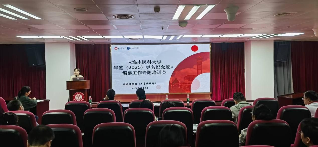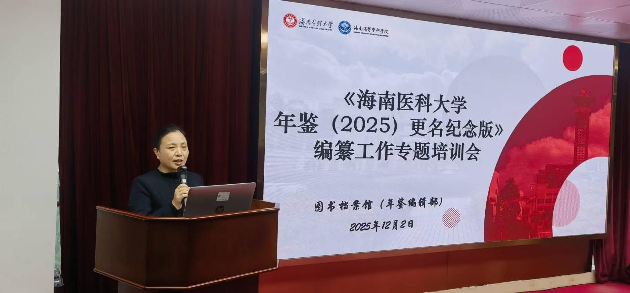 为高质量完成我校首部更名纪念版年鉴编纂任务,统一编纂规范、明确工作要求、提升撰稿质量,2025年12月2日下午,《海南医科大学年鉴(2025)更名纪念版》编纂专题培训会在图书馆七楼学术报告厅隆重召开。海南省史志办年鉴工作处蓝碧茹处长应邀作专题授课,图书档案馆馆长、年鉴编辑部主编朱明月作动员讲话,全校各部门(单位)年鉴编纂联络人及撰稿人参加了培训。培训会由图书档案馆副馆长李咪主持。