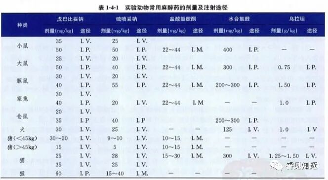 是使用非挥发性全身麻醉药进行麻醉的方法。注射麻醉方法简便,麻醉时间较长,适用于需长时间麻醉的动物实验。一般采用静脉注射、腹腔注射、肌内注射等方法进行麻醉。兔、猫、犬、猪等大动物常采用静脉注射、肌内注射的方法进行麻醉;小鼠、大鼠、豚鼠等小动物常采用腹腔注射的方法。常用麻醉药的剂量及注射途径见下表,但实际工作中影响麻醉效果的因素很多,包括动物的品系、年龄、环境条件、麻醉药的纯度、操作人员的技术熟练程度等因此表中的数据仅供参考,不可盲目照搬。