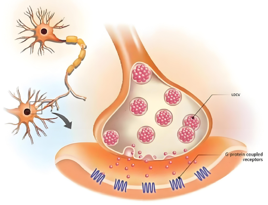 与经典神经递质(如乙酰胆碱、单胺类、氨基酸类)的合成方式不同,SP不是在神经末梢内合成,无活性的SP前体首先在神经元胞体内的核糖体上边合成边进入粗面内质网,经高尔基复合体的修饰加工后形成分泌囊泡,分泌囊泡在向神经末梢运输的过程中,仍可对其中的SP加工修饰,装配在大泡中运至神经末梢,当神经末梢受刺激时,囊泡中的SP即释放,并与其特异性受体结合以发挥作用。