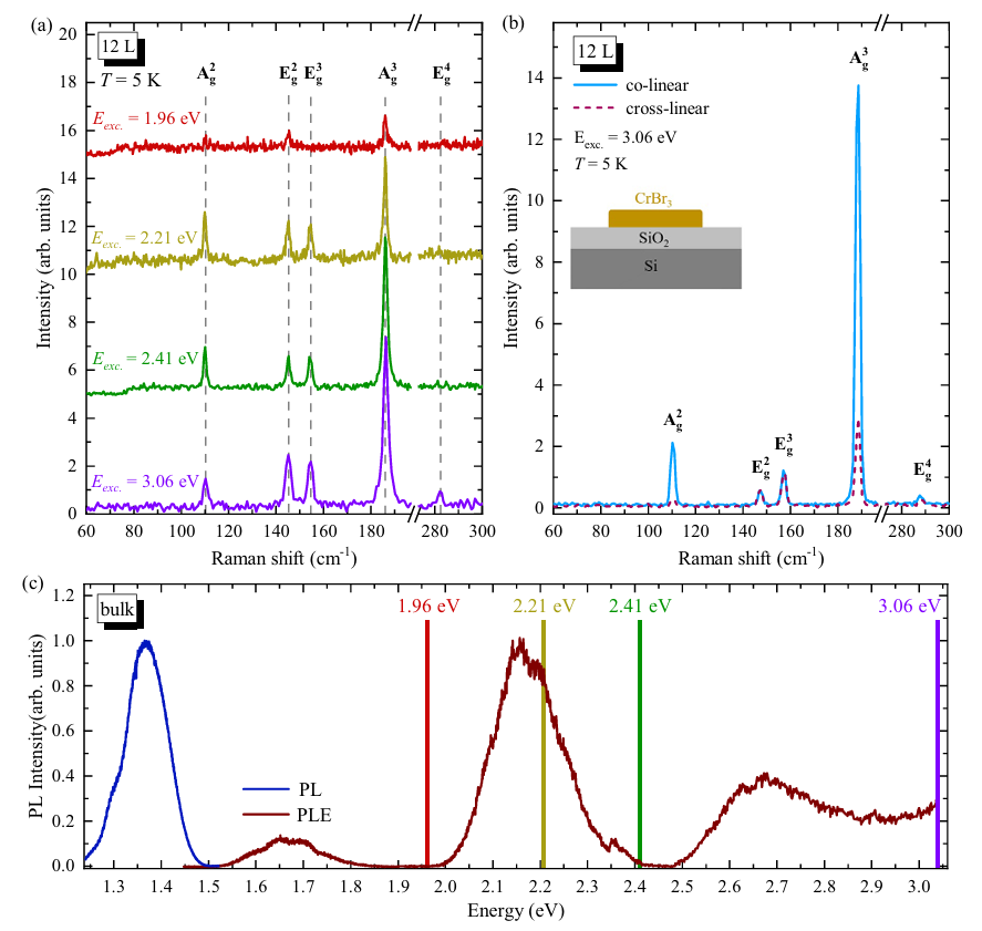 图a直接证明3.06 eV是12层CrBr3的共振激发能量:仅在此能量下,电子-声子耦合效率显著提升,激发专属共振声子模式(Eg4),且不同声子模式的强度响应差异反映激发能量对拉曼散射选择性的调控。