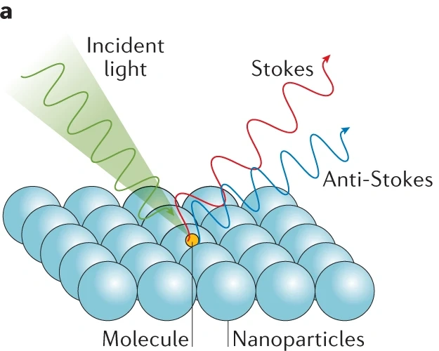 图1. (a)分子吸附在纳米结构颗粒上时的增强拉曼散射,导致发射辐射的频率低于(红色)或高于(蓝色)入射光,分别称为斯托克斯散射和反斯托克斯散射。DOI: 10.1038/s43586-021-00083-6