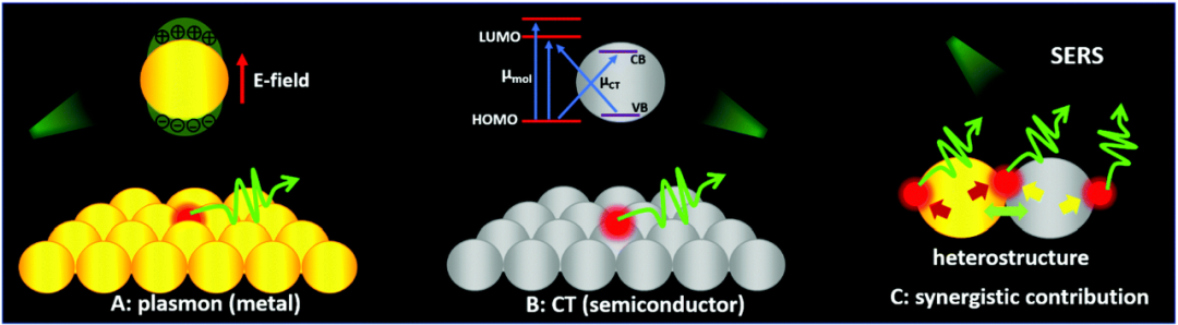 图4. SERS机制示意图:金属上的等离激元介导增强、半导体上的电荷转移(CT),以及金属-半导体异质结构中二者协同增强效应。DOI: 10.1039/D0MH01356K