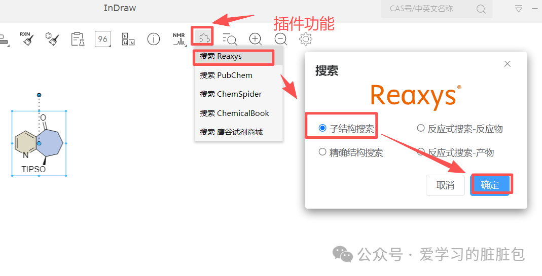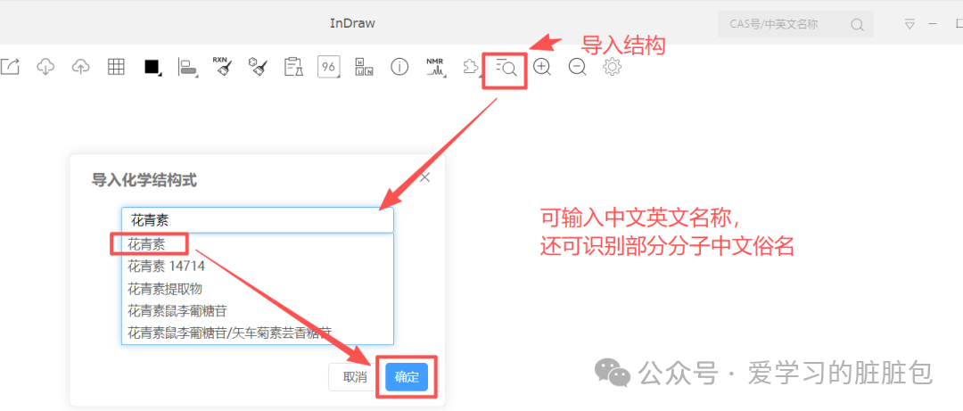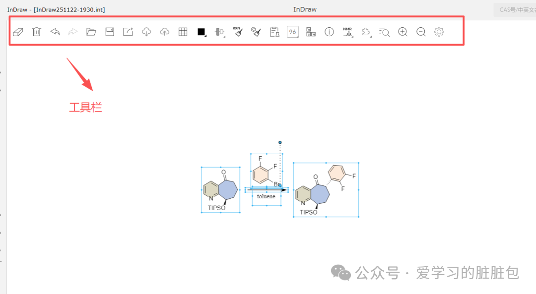在InDraw左侧工具栏中有许多化学结构式,我们在绘制简单化学结构时就可以通过简单操作,绘制出目标结构了,而且,把鼠标放在工具上,会自动跳出中文的功能介绍另外,我们截取文献或图片中的化学结构式,InDraw可一键识别,即使是复杂的手性化学结构图,InDraw也可快速识别出来,如下图准确率高达99%。InDraw也可快速截取当前页面的结构,就是在文献中看到一个结构我们还可以去查找目标结构的CAS号或中英文名称,indraw也支持一键导入化学结构式,甚至可以识别部分中文俗名。绘制结构式后InDraw 和ChemDraw相同,都可直接复制,粘贴到Word、PPT中,双击PPT中的结构式即可在InDraw中编辑和修改。