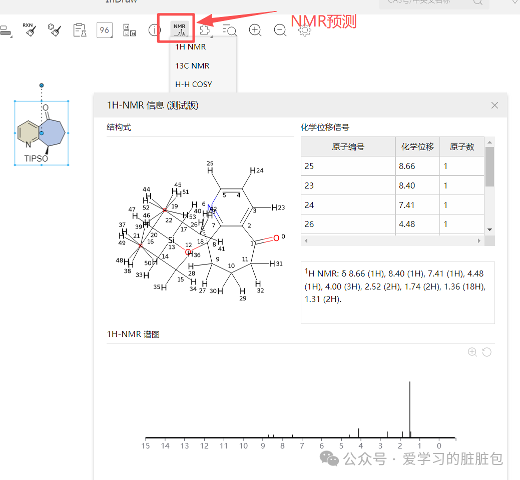 InDraw 的命名系统,能够直接依据化学结构生成对应的英文名称与中文名称。因为截至目前,在全球科研软件领域中,目前尚无任何一款软件能够实现化学结构生成中文名称的功能。核磁预测:绘制好化学结构后,框选整个结构或者需要被预测的特定部分 。然后在菜单栏中找到与核磁共振预测选项,选择需要预测的核磁即可,实测准确度还行,有一定的参考价值。