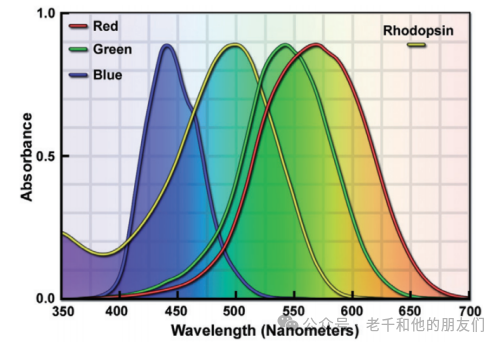 图8 四种人类视觉色素的吸收差异光谱。这些色素在可见光谱的红色、绿色和蓝色区域显示出最大值。这些值接近于在体内对视杆细胞和视锥细胞所测得的值,并且证实了一个多世纪以前麦克斯韦的基于RGB的色觉理论。