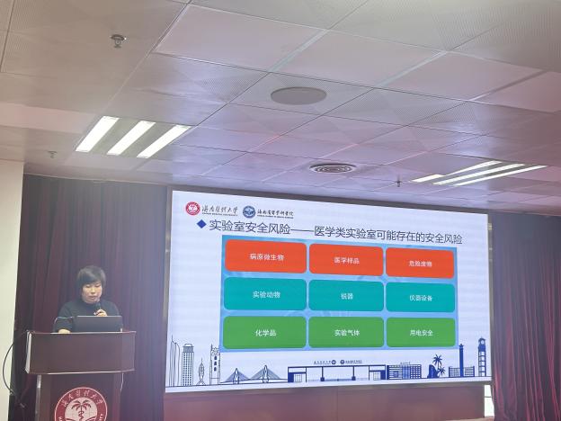 培训伊始,公共卫生学院院长杨国静作开场讲话。她强调了实验室安全在科研与教学工作中的核心重要性,指出“安全”是学院一切工作稳步推进的根本保障。杨院长对进入实验室的同学们提出了明确要求,希望大家始终秉持“安全第一”的原则,严格遵守实验室规章制度,自觉履行安全责任。