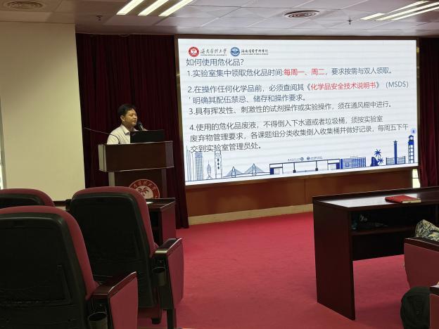 接下来,许琼军高级实验师就危险化学品的安全使用与管理作了专题讲解。他重点介绍了危险化学品的危险性、购买流程、存储要求、使用规范及废弃物处置等方面的规定,通过真实案例剖析了不规范操作可能带来的严重后果,增强了同学们对危险化学品管理的重视程度。