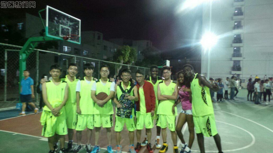 通过前期的参赛人员筛选,国际教育学院组建了一支由中外学生共同参与的篮球队。今天下午,他们身着荧光黄的队服,英姿飒爽地站在灯光球场,成为今晚的主角。