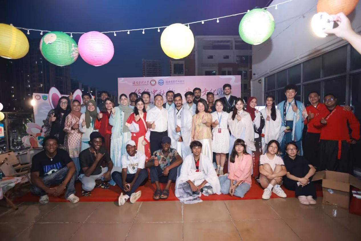 夜幕渐深,皎洁的月光洒在活动现场,中外学子轮番登场,用精彩演出展现多元风采。巴基斯坦留学生AQSA许糖用中文深情演绎歌曲《如愿》;来自印度尼西亚的CECILIA曾小青献唱了一首粤语经典《喜欢你》赢得满场掌声;中国学生李玟洁一曲《借月》,将全场带入静谧而深沉的意境。压轴登场的是汉服社的同学们,她们身着云纹广袖襦裙,月光下翩翩起舞。