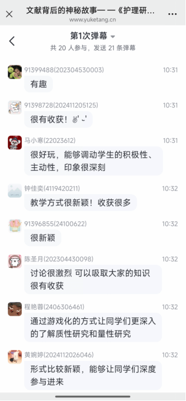 这种以 “剧本杀” 式互动方式开展的《护理研究》游戏化教学,给学生带来了全新的学习体验。学生们在课程分享感受环节纷纷表示,这种教学方式新颖创新,感觉“科研知识以一种奇妙的方式入脑入心”,由此,极大地激发了他们的学习兴趣,改变了抽象乏味的课堂气氛,在主动参与过程中,科研思维、评判性思维得到了充分拓展,也提升了发现问题及小组合作能力,为今后的学习和科研带来了诸多启发,希望更多的学生能够体验这种学习模式。