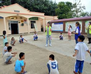 扶贫小队和孩子们一起进行“水果蹲”的游戏