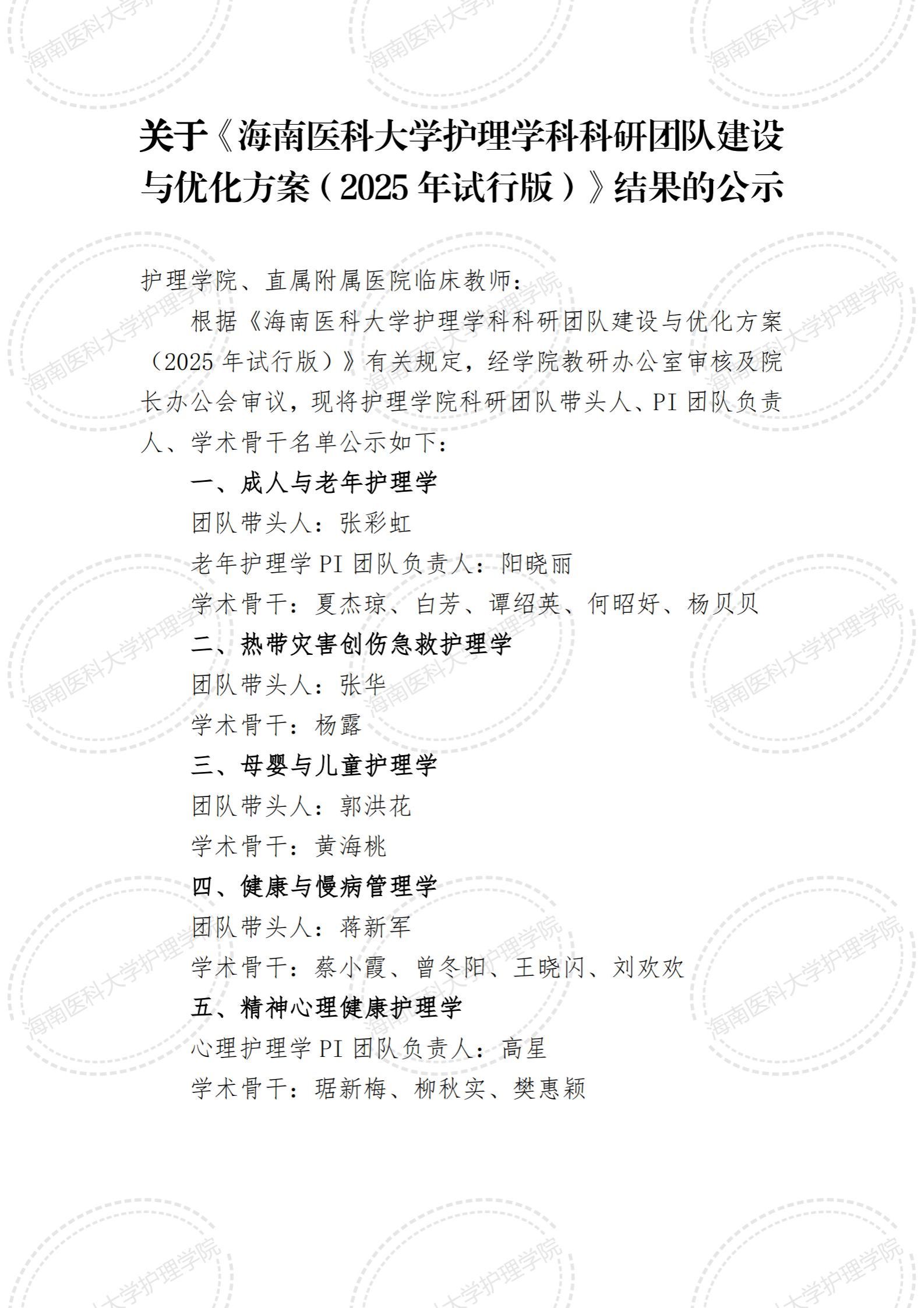 关于《海南医科大学护理学科科研团队建设与优化方案(2025年试行版)》结果的公示(终稿).pdf