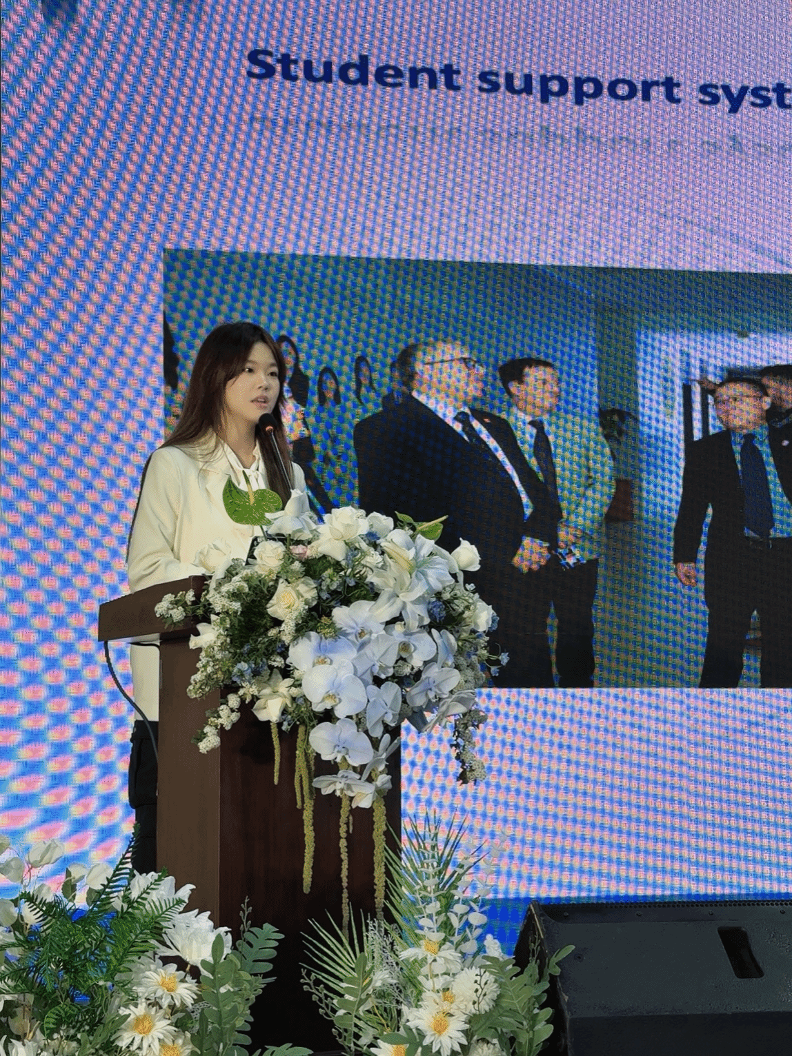 西英格兰学院优秀学生代表、23级护理学本科专业戚饶婷同学,围绕“升学路径与就业支持”主题,进行了精彩纷呈的演讲汇报。她深入剖析了学院在这一领域所采取的创新举措,并分享了宝贵的实践经验。从学院“党建+思政+专业+语言+科研”五位一体的育人机制,到ARE(All-Around Education)中英特色融合学生支持体系;从一对一学生咨询服务平台的贴心服务,到OBE(Outcome based education)模式下学生学涯规划和就业指导的人才培养规划理念;从国际化视野培养海外研学活动的广阔视野,到情景化教学和临床见习优势资源的深度融合,戚饶婷同学均进行了详尽阐述,赢得了与会嘉宾的一致好评。
