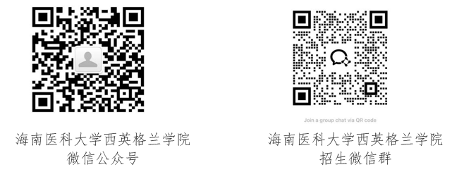 欢迎扫描下方二维码,关注“海南医科大学西英格兰学院”微信公众号获取更多招生信息。同时加入微信群咨询招生信息。