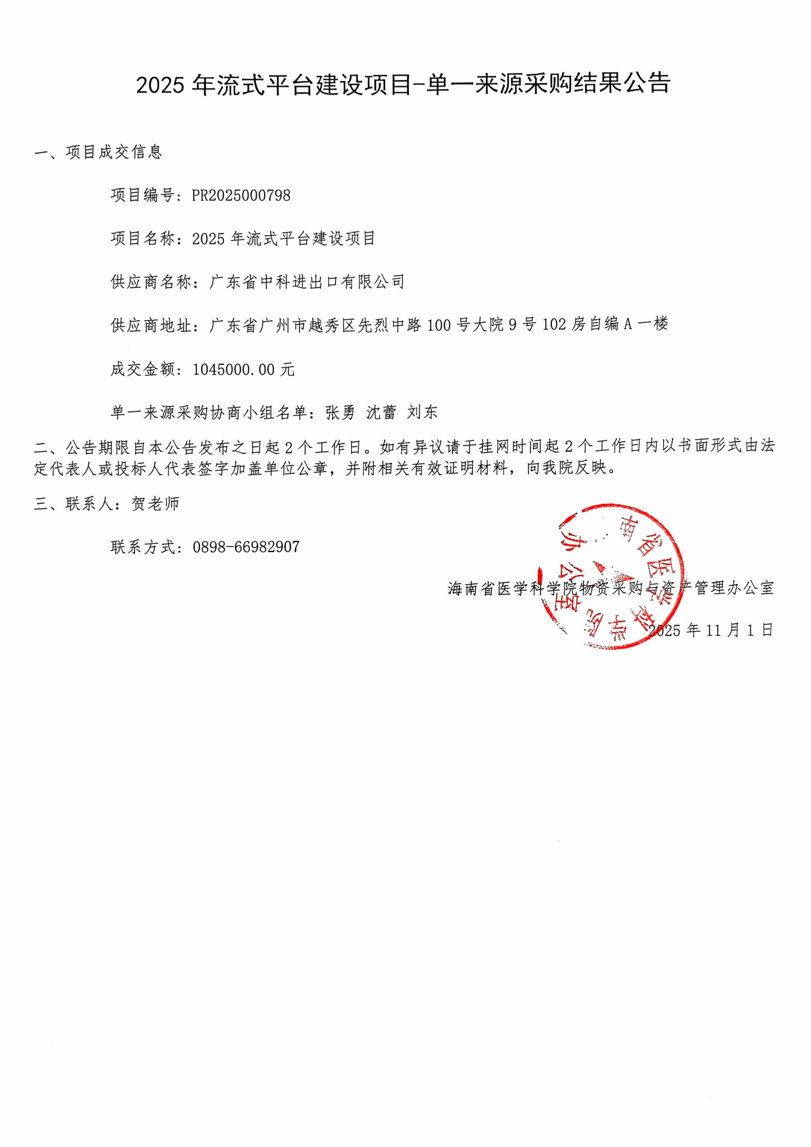单一来源采购协商小组名单:张勇 沈蕾 刘东