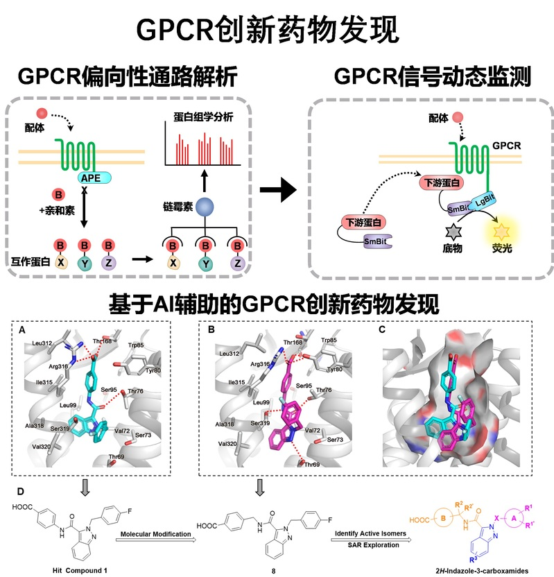 GPCR是最大的药物靶标家族,超过30%的已上市药物以GPCR为靶标。然而,针对GPCR的创新药物开发仍然存在诸多技术难点。本课题组通过发展高通量高灵敏GPCR活性测试体系,建立GPCR功能偏向性信号识别方法,结合人工智能药物发现技术以及特异性的基因修饰和疾病动物模型,建立了高效的GPCR药物发现体系。目前,本课题组已开发多个靶向GPCR的药物先导物。其中,GPCR受体成员EP4小分子拮抗剂YY001已正式获国家食品药品监督管理局批准开展针对晚期实体瘤的II期临床试验(2024)。