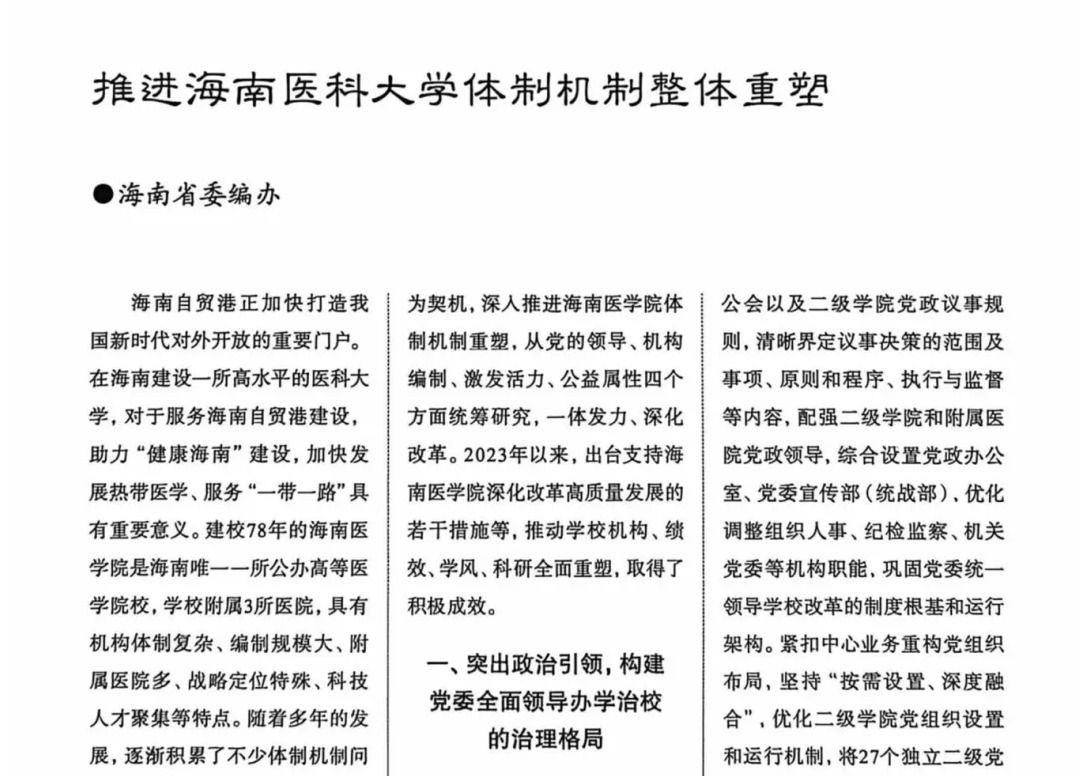 编者按:近日,《中国机构编制》刊发海南省委编办撰写的文章《推进海南医科大学体制机制整体重塑》,对我校体制机制改革进行专题介绍。海医体制机制改革紧扣政治引领、机构重塑、活力激发、公益属性四大重点,靶向破解发展堵点,全力贴合自贸港建设与民生保障需求,学校治理效能、办学实力、科研发展、人才引育均实现跨越式提升,探索出一条既切合海医实际,又可借鉴的高校治理新路径。海南自贸港正加快打造我国新时代对外开放的重要门户。...