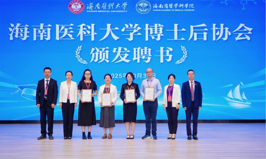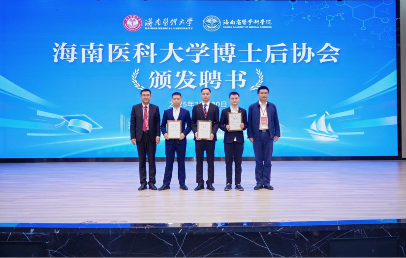 随后,举行海南医科大学博士后协会揭牌仪式。在与会嘉宾的共同见证下,涂明捷、贾彬与我校附属海南医院副院长陈峰、研究生院院长张帆、教育发展基金会理事长郭宇、科学技术发展研究院副院长李凯共同为协会首届会长、副会长、秘书长、副秘书长颁发聘书。协会的成立,旨在搭建博士后学术交流与成长平台,是学校深化博士后人才培养机制、强化内部协同创新的有力举措。