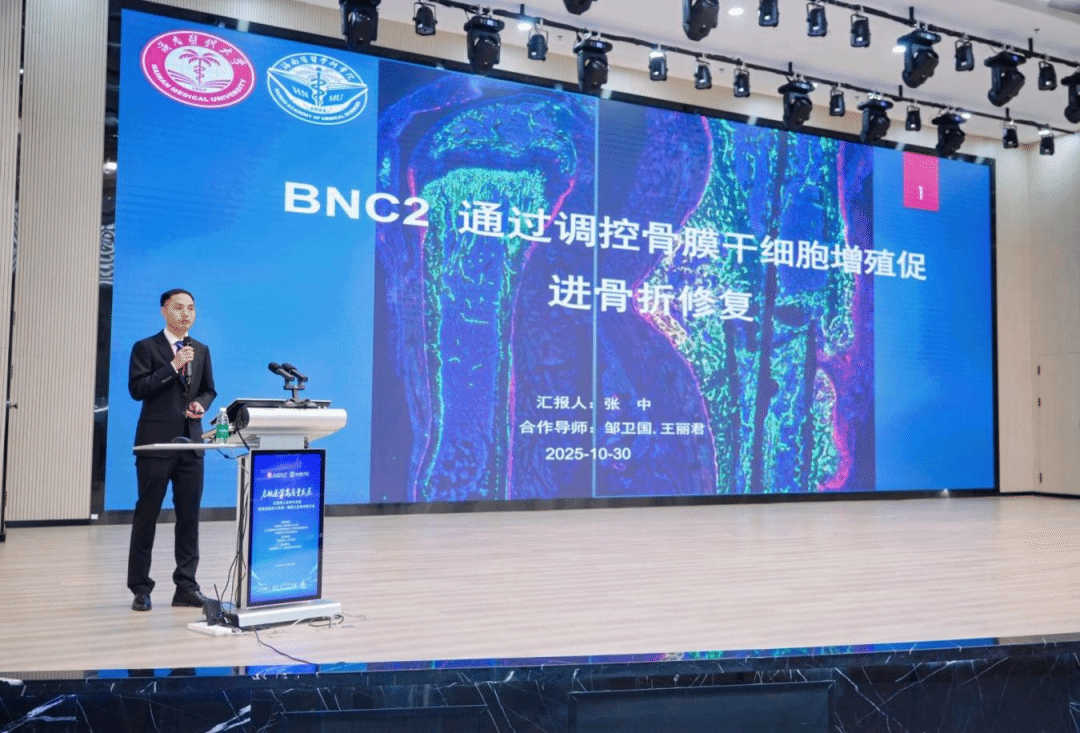 我校博士后张中、杭旭东分别以《BNC2 通过调控骨膜干细胞增殖促进骨折修复》《靶向a-酮戊二酸氧化还原酶驱动氧化还原循环介导ROS生成助力难治性幽门螺杆菌的根除治疗》为题,就骨骼干细胞与骨折修复、幽门螺杆菌治疗等课题进行了报告。