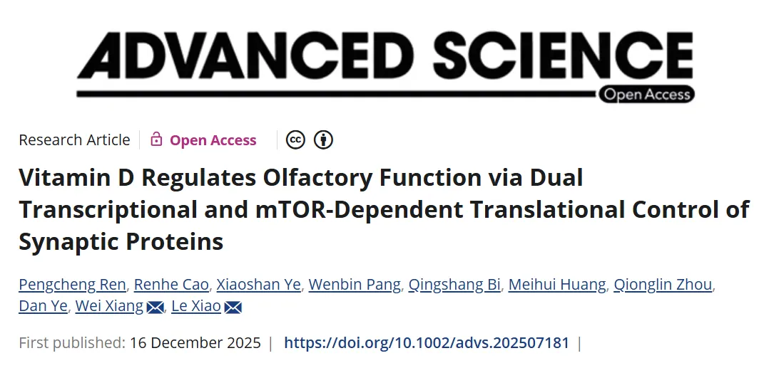 近期,海南医科大学儿科学院(海南省妇女儿童医学中心)的肖乐教授和向伟教授在《Advanced Science》以封面推荐的形式在线发表了题为“Vitamin D Regulates Olfactory Function via Dual Transcriptional and mTOR-Dependent Translational Control of Synaptic Proteins(维生素D通过转录与mTOR依赖的翻译双重调控突触蛋白表达影响嗅觉功能)”的文章。
