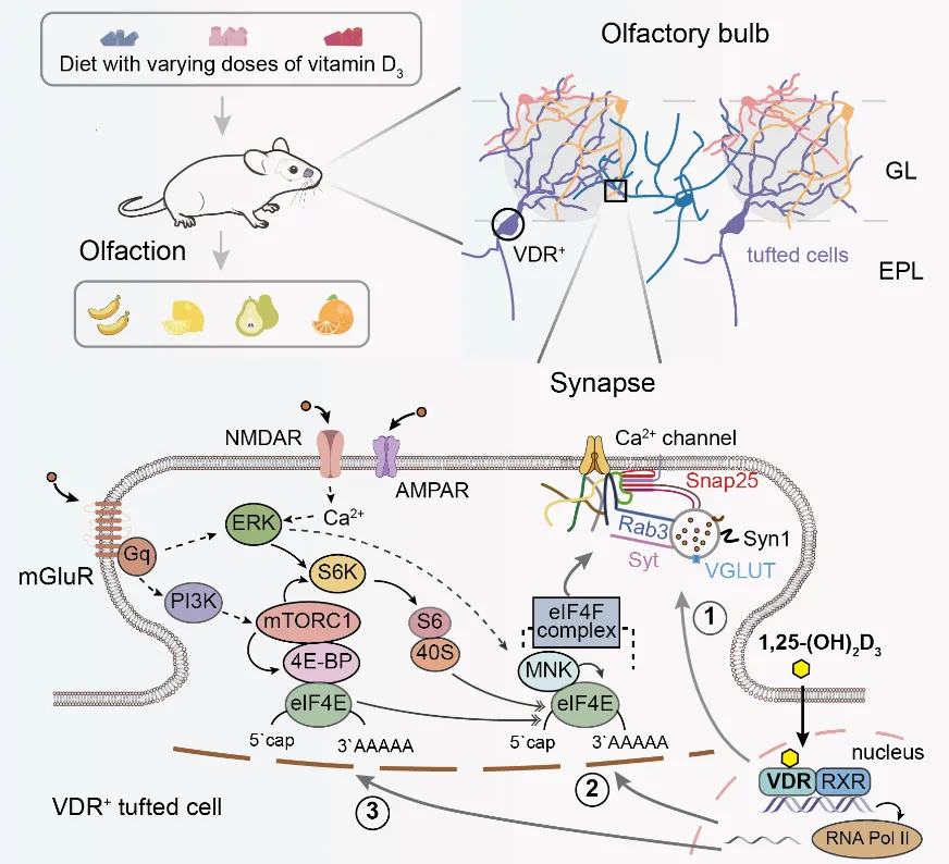 维生素D-VDR信号通路主要通过转录以及mTOR依赖的翻译调控嗅觉簇状神经元突触功能,进而影响小鼠的嗅觉分辨能力
