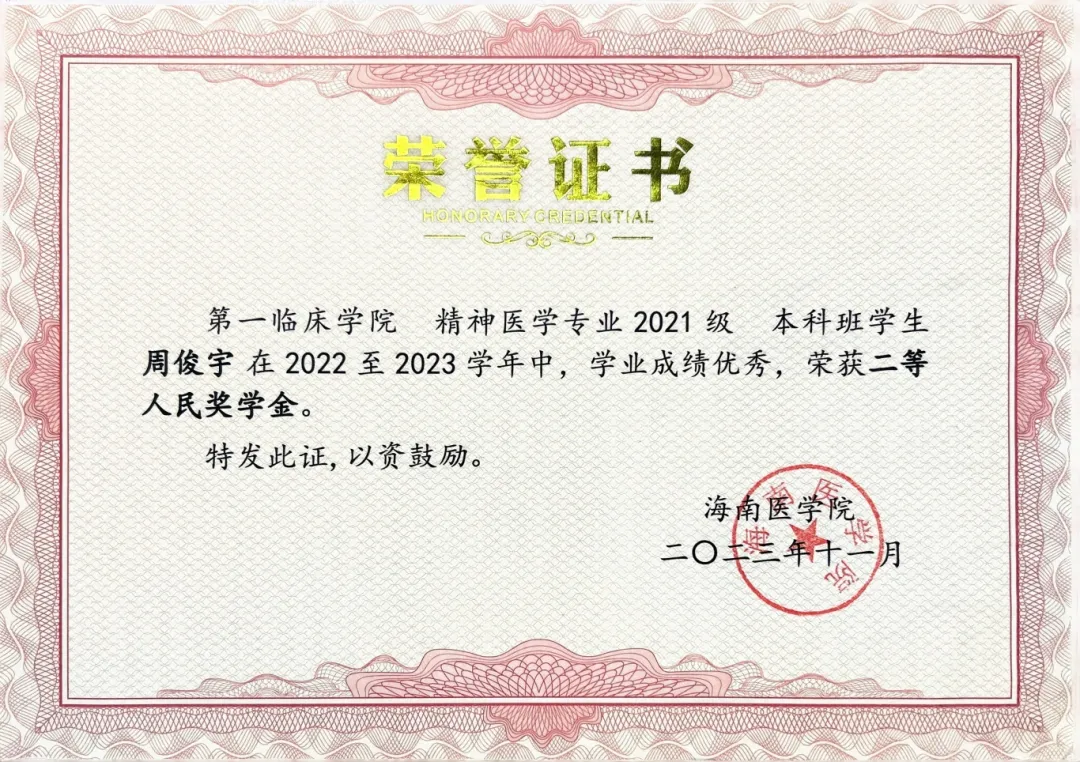 综合发展方面,他连续两次从全校12000余名本科生中脱颖而出,荣获“强国奖学金”,并多次获评校“三好学生”“人民奖学金”及“文体活动积极分子”等荣誉。