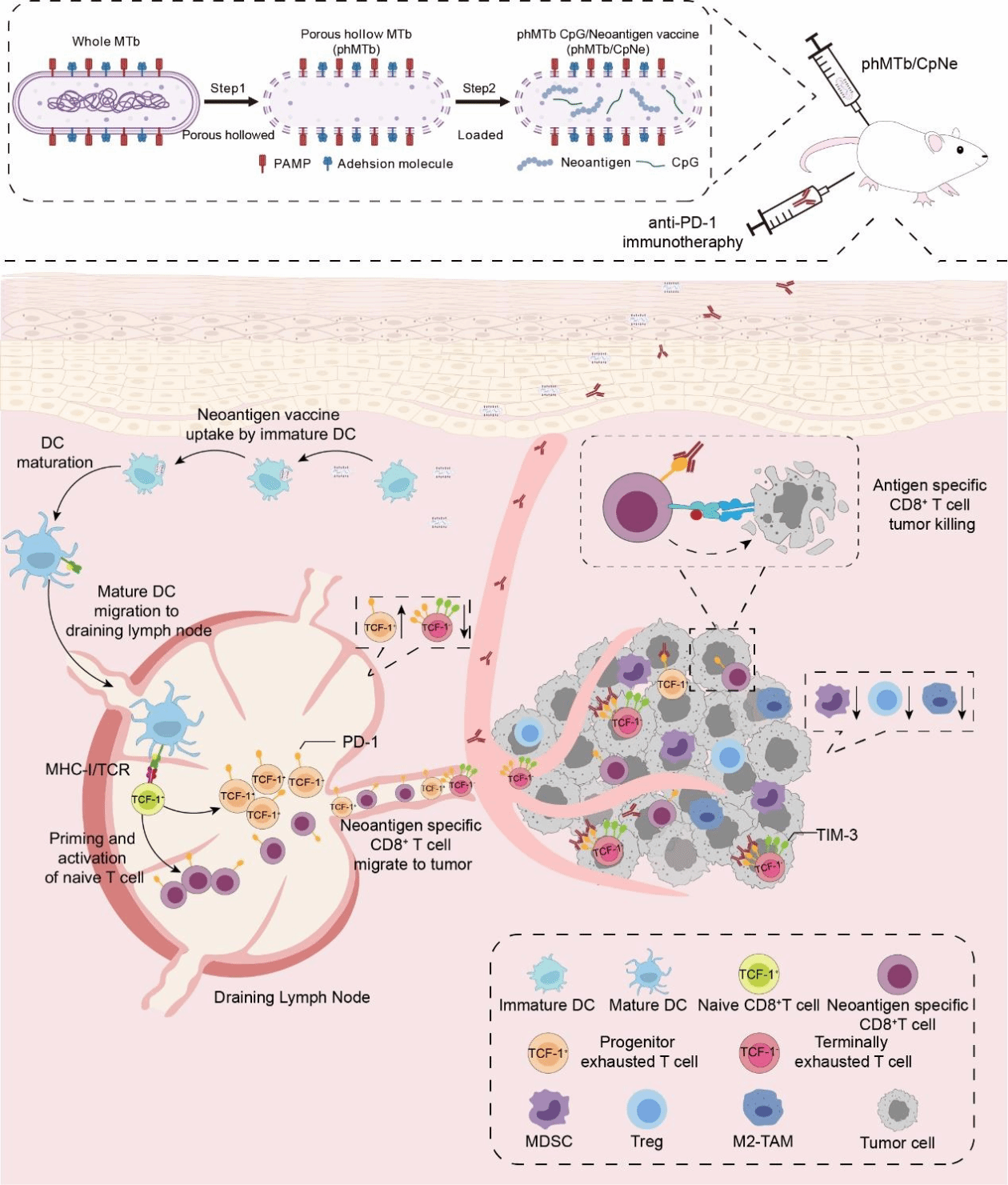该研究报道了一种基于有孔中空结核分枝杆菌(phMTb)的疫苗载体,用于装载肿瘤新抗原和免疫佐剂CpG以制备疫苗。phMTb表面的病原相关分子模式及其特异性黏附分子有效增强了树突状细胞(DC)对phMTb及其携带肿瘤新抗原的摄取能力。该疫苗能够促进DC的成熟和激活,促进肿瘤新抗原的交叉呈递,并促使携带phMTb的DC向淋巴结迁移,从而增强效应和记忆CD8+ T淋巴细胞的功能。在小鼠肿瘤模型中,使用phMTb作为载体制备的新抗原疫苗进行免疫接种,诱发了强烈的肿瘤特异性细胞毒性T淋巴细胞免疫反应,并且不良反应最小。此外,接种含有phMTb的新抗原疫苗有效逆转了肿瘤的免疫抑制微环境。同时,以phMTb为载体制备的肿瘤新抗原疫苗与抗PD-1抗体协同发挥了显著的抗肿瘤作用。该研究表明,基于phMTb的肿瘤新抗原疫苗制剂可能成为用于临床转化的新型肿瘤疫苗。