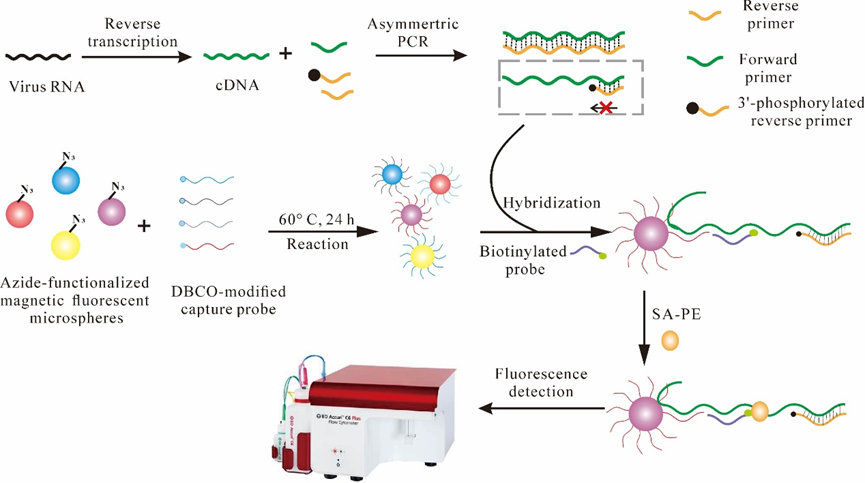 本团队创新利用不对称PCR与悬浮微球阵列技术,开发了一种称为AP-SBA的多重检测方法,用于同时定量检测四种登革热病毒血清型。该方法首先通过不对称PCR生成血清型特异性单链DNA模板,然后与微球耦合的捕获探针和生物素化报告探针进行杂交,实现了高灵敏度和高特异性的多重检测。研究表明,该方法具有卓越的灵敏度及动态检测范围。同时,该方法表现出优异的特异性,能准确区分不同血清型。总体而言,AP-SBA方法是一种强大可靠的定量检测工具,不仅适用于登革热病毒血清分型,还可适配于其他核酸病毒的检测与分型,为病毒学研究和诊断提供了新平台。