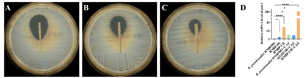 该课题组与三亚市人民医院检验科陈海主任合作,以临床Bp头孢他啶耐药株为实验对象,经全基因组测序发现,相比于野生型,耐药株中编码A型β内酰胺酶基因(penA)的539位胞嘧啶突变为胸腺嘧啶,从而导致氨基酸序列上的脯氨酸转变为亮氨酸。继续对耐药株中的penA进行敲除,或将含点突变的penA引入野生型Bp,证明该点突变可导致菌株的头孢他啶耐药能力上升,推测是该突变导致了PenA蛋白的保守区产生了更加适合水解头孢他啶的构象改变。研究人员同时注意到单一的penA点突变无法让菌株达到临床耐药株相一致的头孢他啶耐药能力,为此还进行了相关基因的转录分析,发现耐药株中还存在penA的高表达,并在头孢他啶的刺激下,penA的转录水平会进一步提高。该研究合理推测海南Bp的耐药率异常可能是头孢他啶作用下,penA的高表达导致了少部分菌株转化为耐受或持留菌得以存活,一旦penA又出现特殊的点突变(如上述的539位胞嘧啶突变为胸腺嘧啶),最终Bp会在治疗过程中表现出头孢他啶耐药。