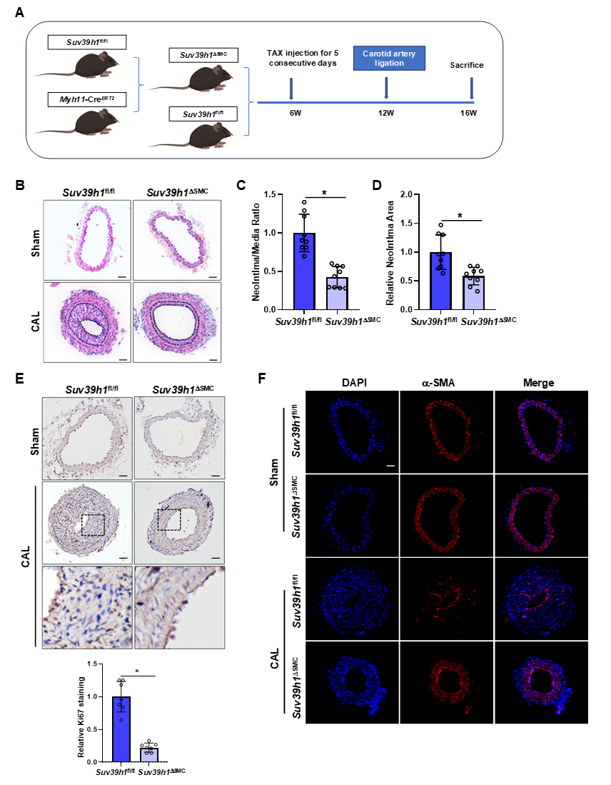 接着,研究者构建了平滑肌细胞Suv39h1特异性敲除(Suv39h1DSMC)小鼠,发现颈动脉结扎或股动脉穿刺手术之后,相比对照组, Suv39h1DSMC小鼠中Suv39h1的缺失减少了损伤动脉中新生内膜形成,降低了内膜/中膜比率和相对新生内膜面积,VSMC表现为增殖能力降低、收缩标记蛋白增加。