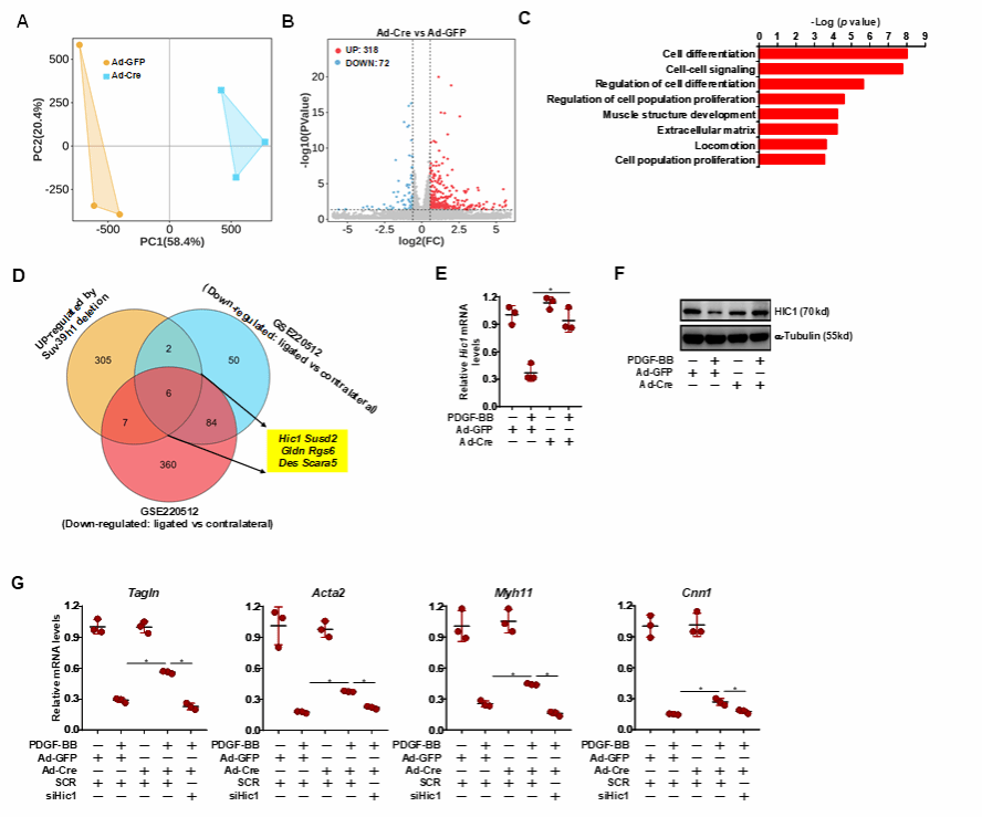 利用RNA-seq实验揭示HIC1为Suv39h1的潜在靶基因,HIC1表达在血管损伤和Suv39h1缺失条件下上调。VSMCs中Suv39h1基因敲除或被F5446抑制后,HIC1表达恢复正常。siRNA沉默HIC1和Suv39h1或沉默HIC1同时给予F5446,可逆转Suv39h1缺失的效应。