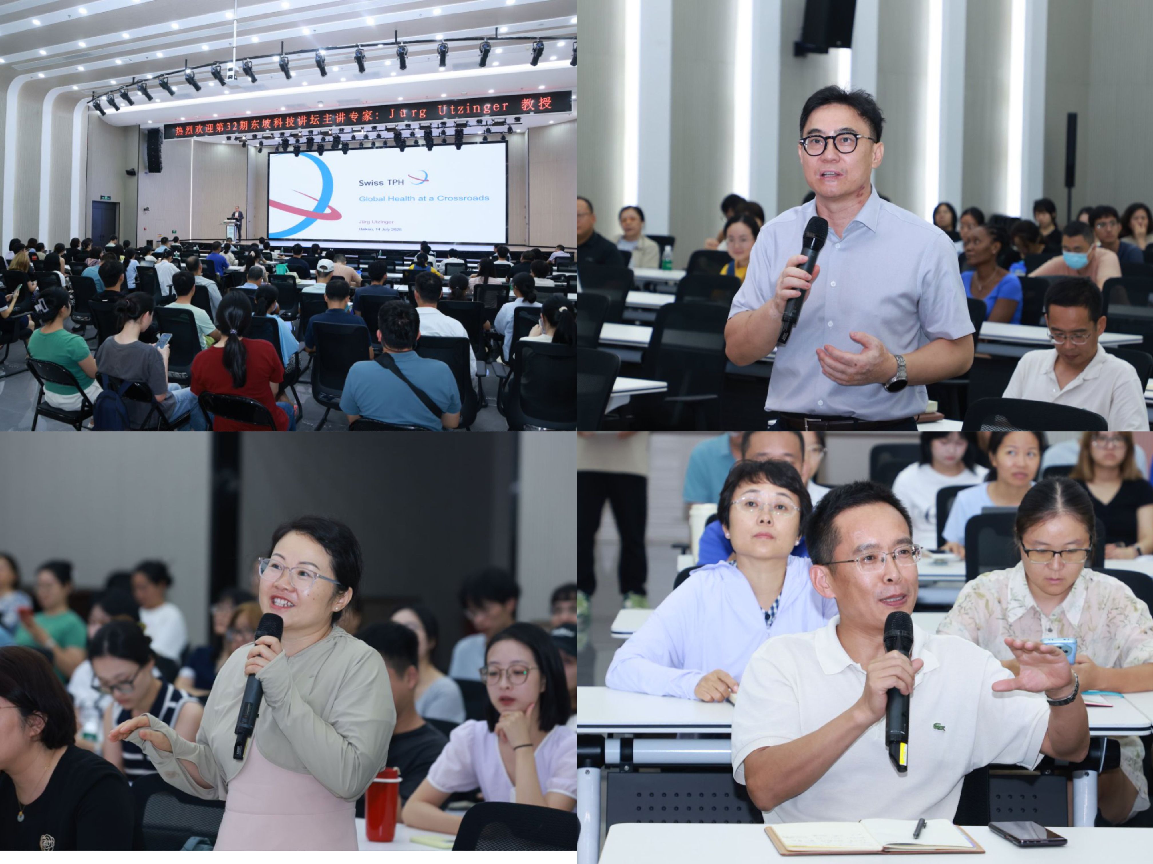 2024年中国政府友谊奖获得者、全健康研究基金会主席Robert Bergquist、我校公共卫生学院院长宁毅、副院长张荣光,热带医学院行政负责人夏乾峰教授、科学技术发展研究院副院长李凯、瑞士TPH行政主任Mathias Kronig等专家学者到场参加讲坛。
