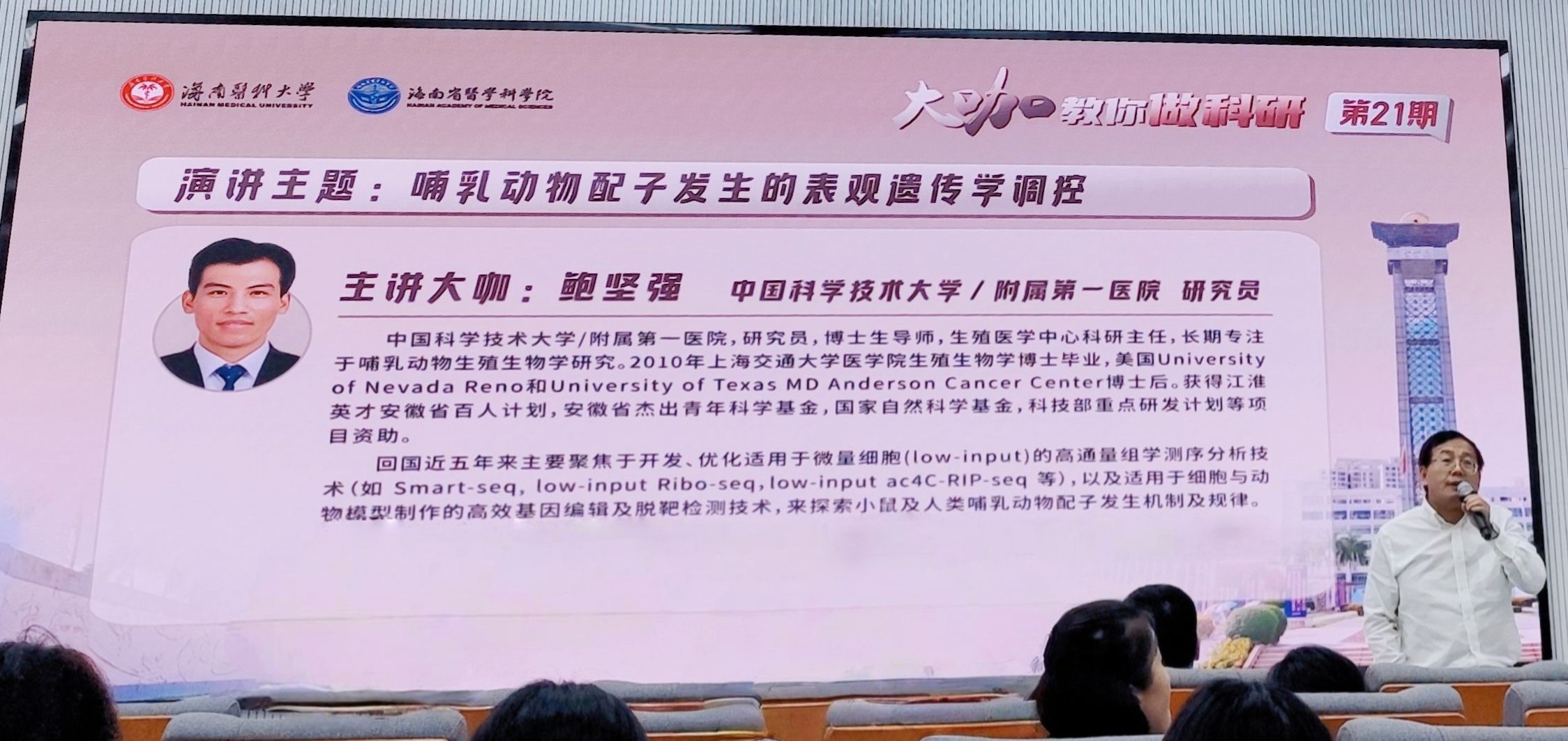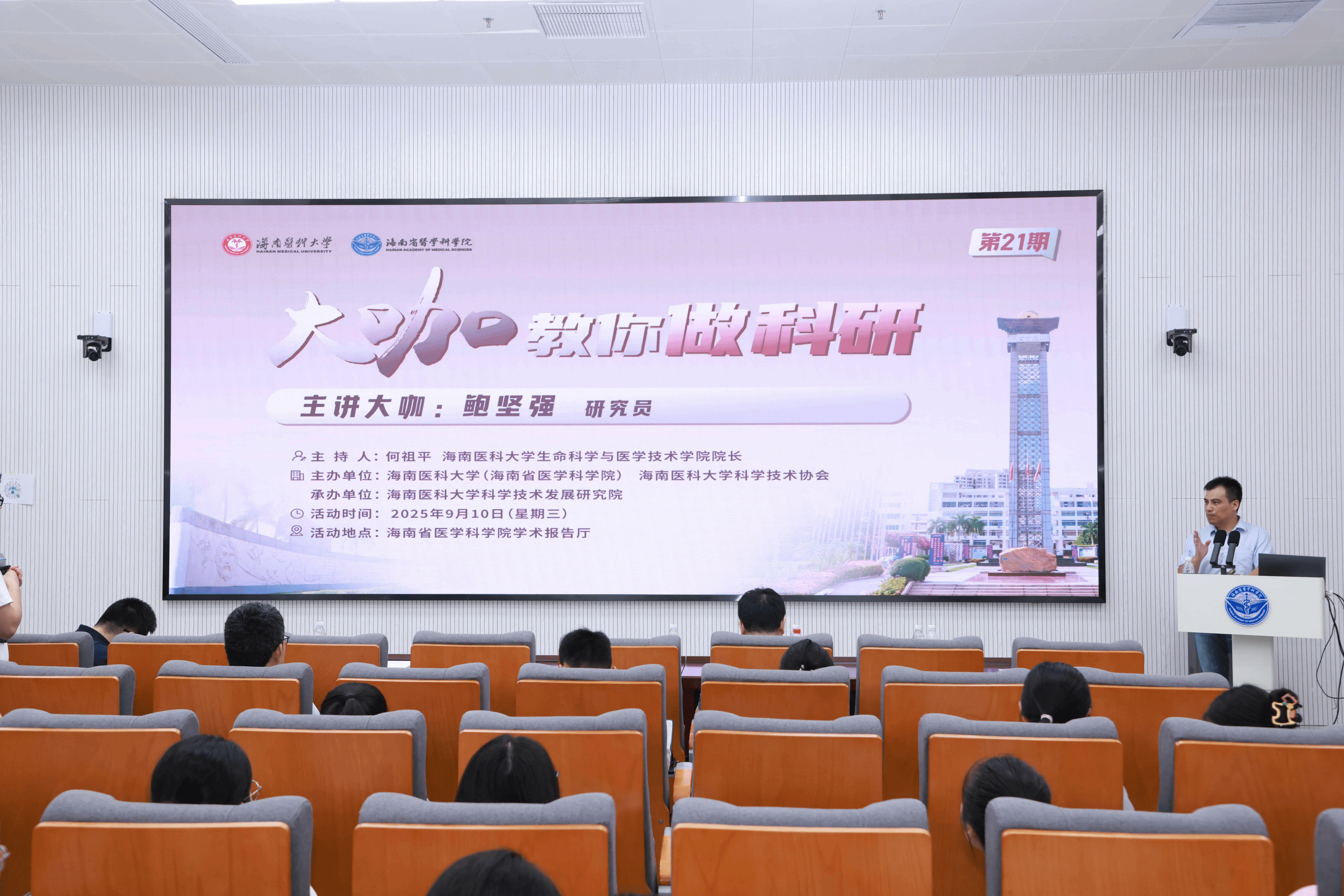 9月10日下午,由我校主办的第21期“大咖教你做科研”活动在海南省医学科学院圆满举行。本次活动特别邀请中国科学技术大学/附属第一医院鲍坚强教授担任主讲嘉宾,吸引了校内众多师生及科研同行踊跃参与,现场学术氛围浓厚。活动由我校生命科学与医学技术学院院长何祖平教授主持。