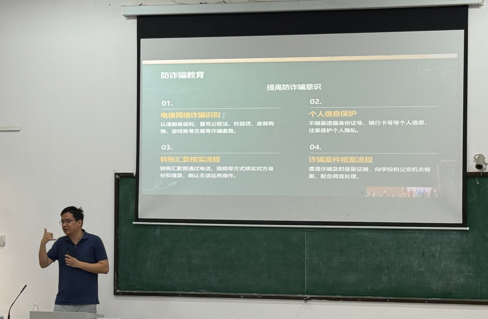 会议伊始,黄慈云从六个维度为同学们进行了详细的讲解。他强调,生命只有一次,同学们在日常生活中要严格遵守交通规则,拒绝乘坐“黑车”,禁止前往野外或者不安全的水域游泳;在宿舍内要规范用电,不使用违规电器,保持整洁卫生;在实验室必须严格遵守操作规程,佩戴防护用具。针对电信网络诈骗高发态势,他重点剖析了冒充公检法、虚假购物等诈骗套路,提醒同学们保护好个人隐私,坚决抵制“校园贷”陷阱。