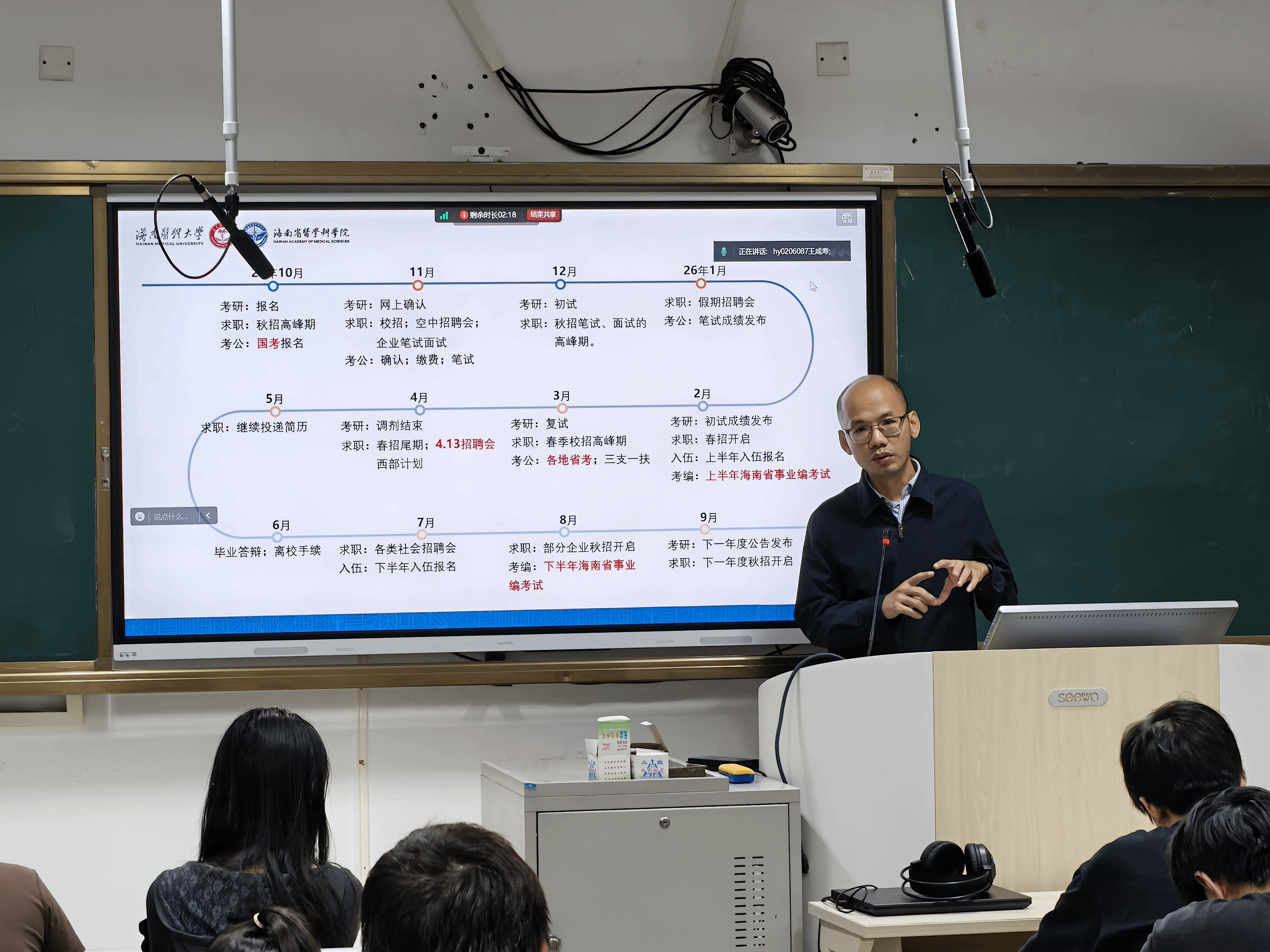 随后,学院学工办王咸寿老师围绕毕业生关切的核心问题展开系统讲解。他详细解读了国家及学校最新就业政策,深入分析了当前医药卫生领域就业市场的机遇与挑战,并针对简历制作、面试礼仪、职业规划等实用技能进行了专题指导。此外,王老师还重点介绍了教育部、省人社厅、学校等各部门就业信息发布平台、招聘渠道及基层就业项目申报时间、流程等,鼓励毕业生多维度获取信息,主动对接用人单位。