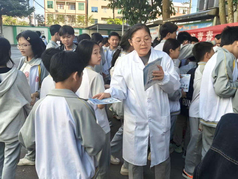 2025年11月22日,基础医学院教师第一党支部带领西英格兰学院和临床医学院2024级本科生,联合海口市永兴镇医院医生,走进海口市永兴中学,为百余名师生开展了一场主题为“守护心灵之窗与健康之齿”的党建医学科普活动。活动通过趣味互动、实践体验、家校联动等形式,旨在增强初中生爱眼护眼、爱牙护牙意识,普及科学用眼和口腔保健知识,为百余名师生带来了一场生动实用的科普盛宴。