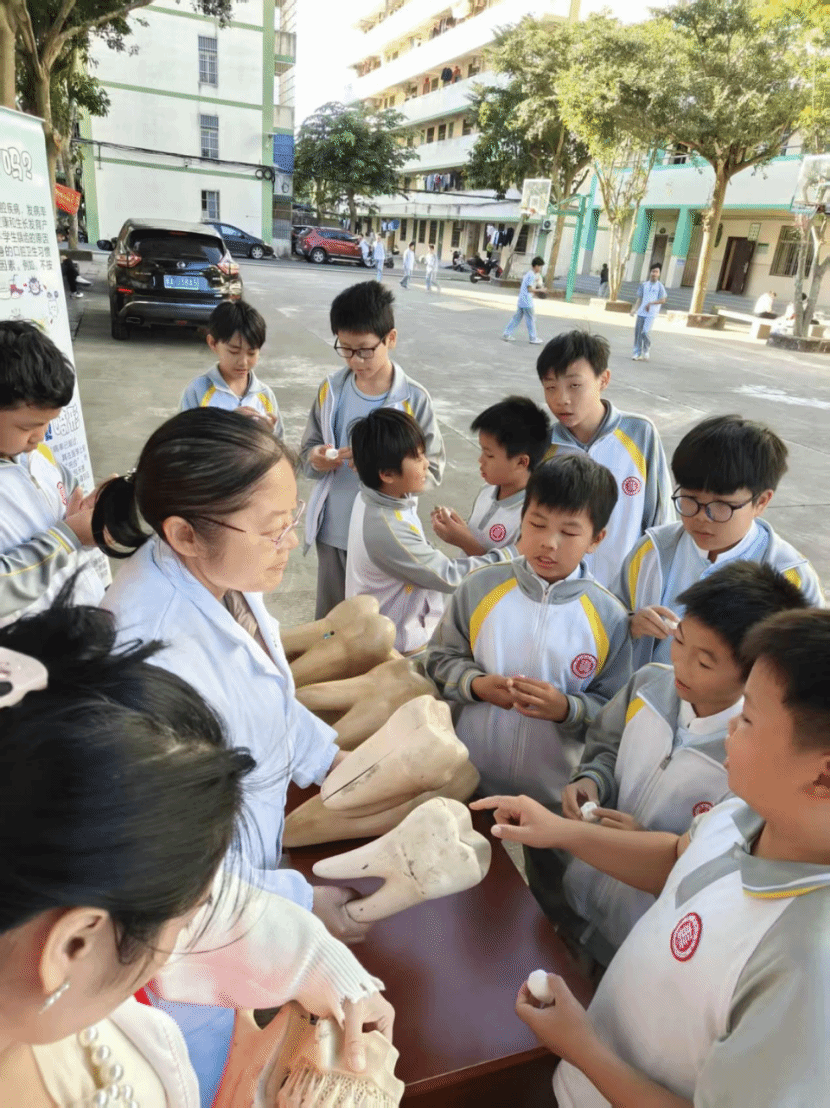“爱牙小卫士”环节中,学生们分组开展口腔检查、正确刷牙演示及牙线使用比赛,在镇卫生院医生指导下学习巴氏刷牙法和牙线技巧;并用橡皮泥制作尖牙、切牙、磨牙模型,通过动手实践加深对牙齿结构的理解。