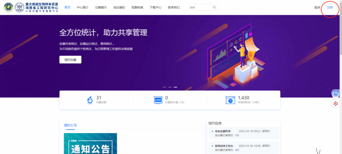 1. 我中心实验平台使用预约缴费管理系统,首次注册,需在医院IP外网电脑登录http://172.18.1.45 网页进行注册,后续使用可在微信公众号关注“百能预约助手”,选择“重大疾病生物样本资源海南省工程研究中心”上预约、查阅信息。学生用户需要在导师完成注册后方可进行注册,并在注册过程中正确选择所属导师课题组。详细操作如下: