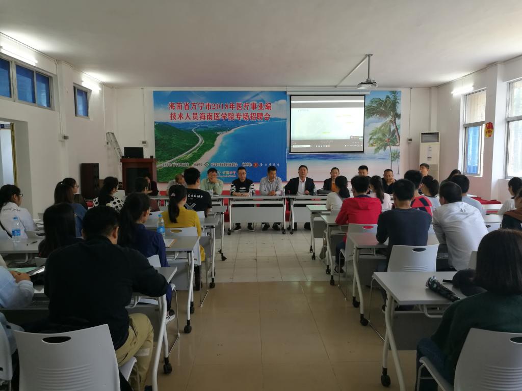 3月13日,由万宁市人民政府主办、万宁市卫生和计划生育委员会承办、海南医学院协办的海南省万宁市2018年临床医疗医技事业编制工作人员海南医学院专场招聘会在我校大学生中心演播中心召开。我校招生与就业指导处处长郭宇代表学校欢迎万宁市招聘团一行。万宁市人民政府高度重视本次招聘活动,由万宁市卫生和计划生育委员会副主任卢传毅、万宁市人民医院院长陈吴荣等13人组成招聘团。本次的招聘会历时两天, 13日上午召开宣讲会并全天接受毕业生应聘报名,14日上午进行面试下午现场签约落实事业编制。招聘对象为我校应届毕业生,用人单位将从专业成绩、思想品德、爱岗敬业精神等条件出发,招聘适合的人才。
