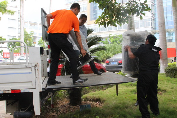 龙马环卫工程有限公司派专车满载果皮箱送至海医