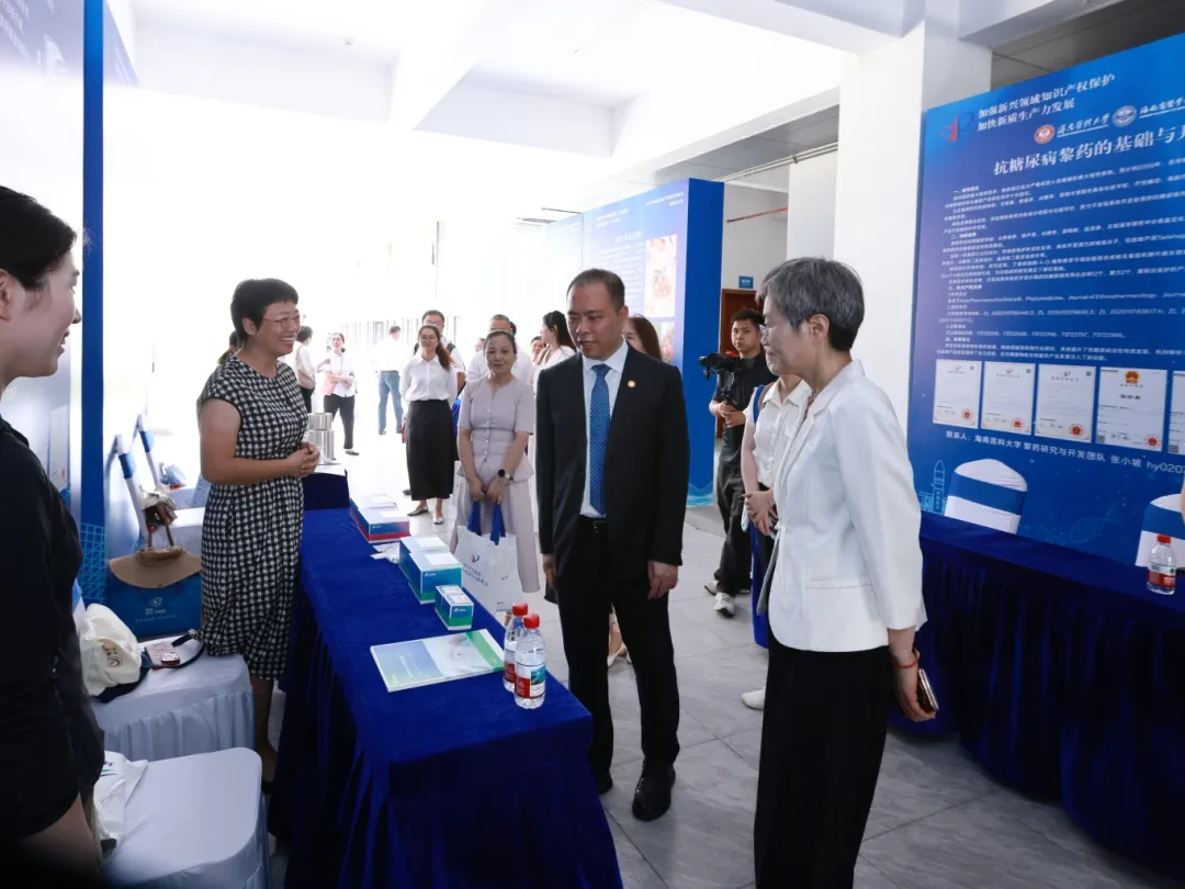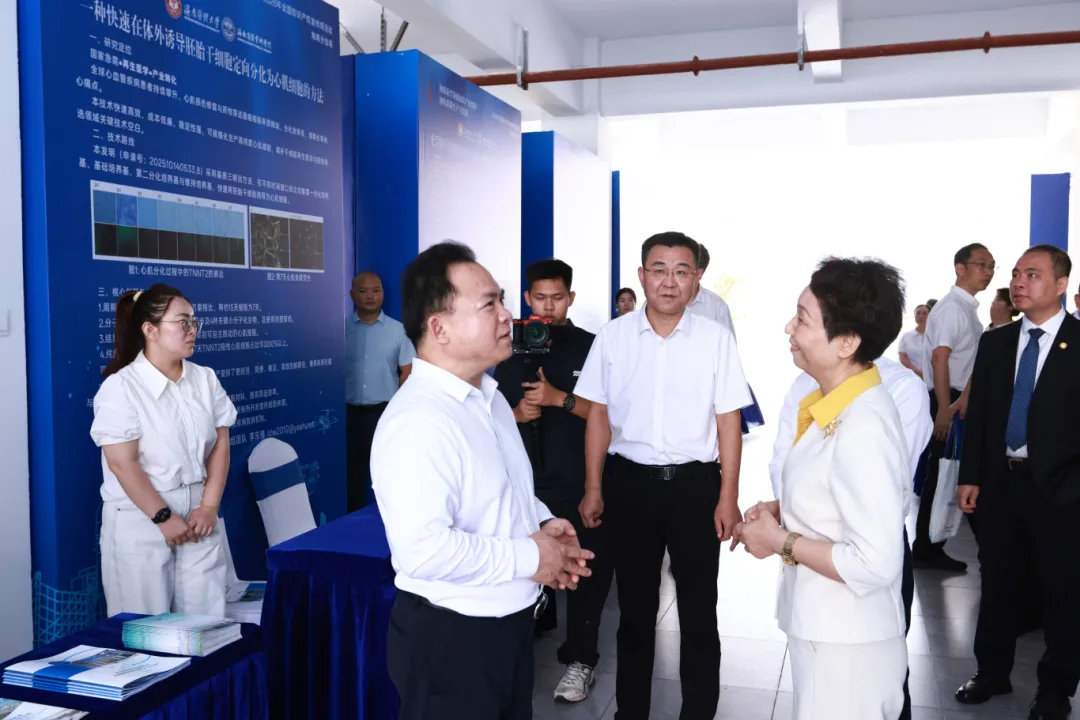 仪式后,李锋、曲淑君等领导在我校领导陪同下,参观了学校科技成果展台,并重点考察了光学探针精准医疗、立克次体病检测试剂盒、抗糖尿病黎药研究、干细胞分化方法等代表性成果,与项目团队交流了解研发与转化情况,对我校的科技创新与知识产权工作给予了充分肯定。