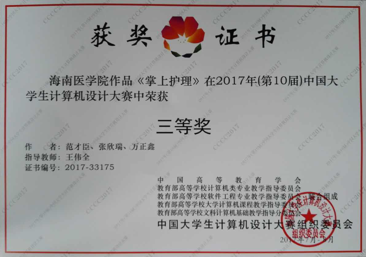 作为海南省唯一的一所入围软件服务外包组总决赛的高校,由我校何红、余远波老师指导的《院外综合控糖APP》(完成学生:戴文彪、石荣辉、陆泽游、王泽奇、苏钰蕊)荣获二等奖,由王伟全老师指导的《掌上护理》(完成学生:范才丞、张欣瑞、万正鑫)荣获三等奖。