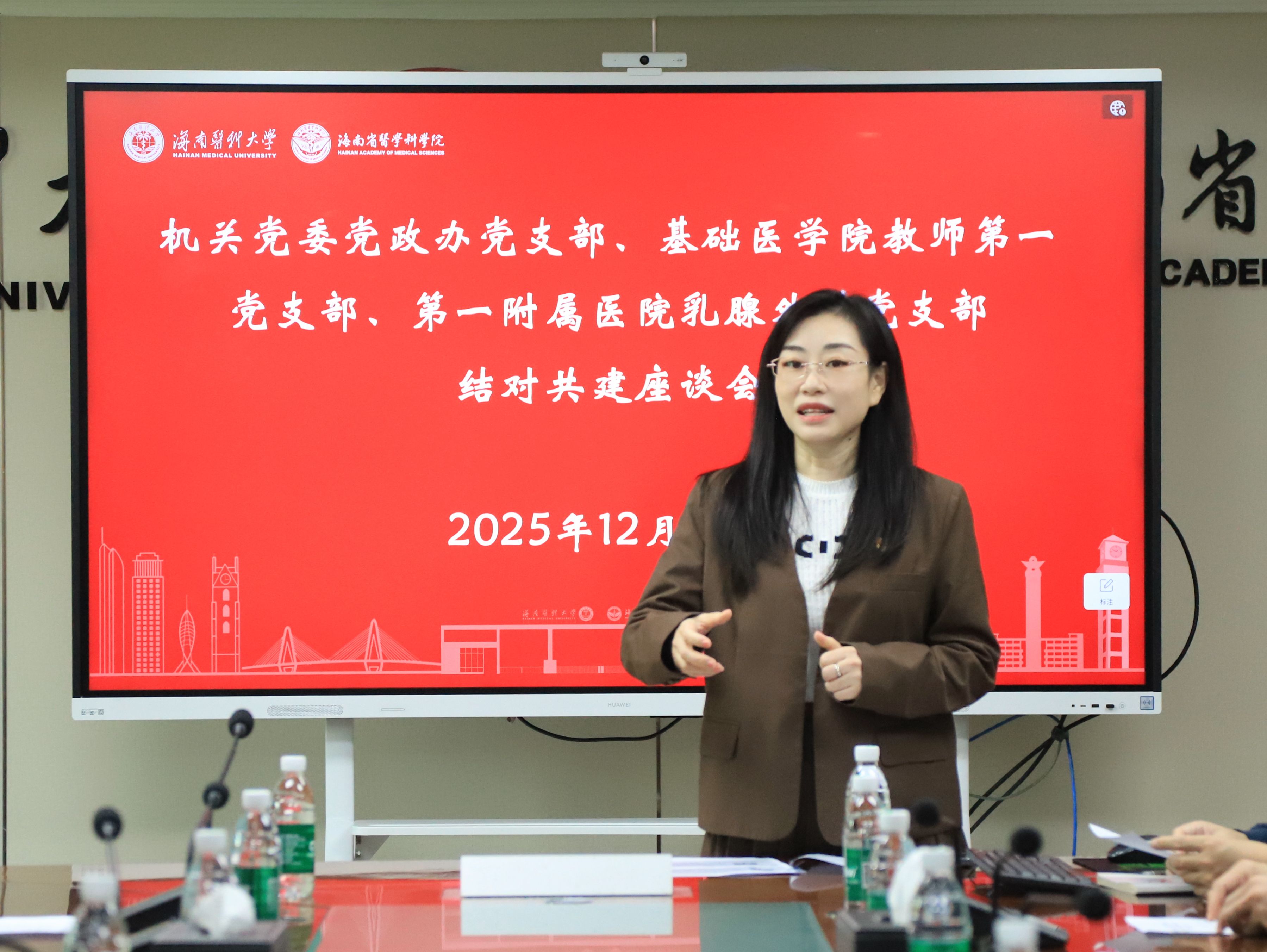 12月19日下午,机关党委党政办党支部联合基础医学院教师第一党支部、第一附属医院乳腺外科党支部,以“党建引领暖人心 结对共建凝合力”为主题,在文墀楼第一会议室及相关分会场举办结对共建活动。本次活动旨在深入贯彻落实新时代党的建设总要求,通过健康科普讲座与现场义诊服务相结合的方式,将党建工作成效转化为服务教职工健康的具体行动。