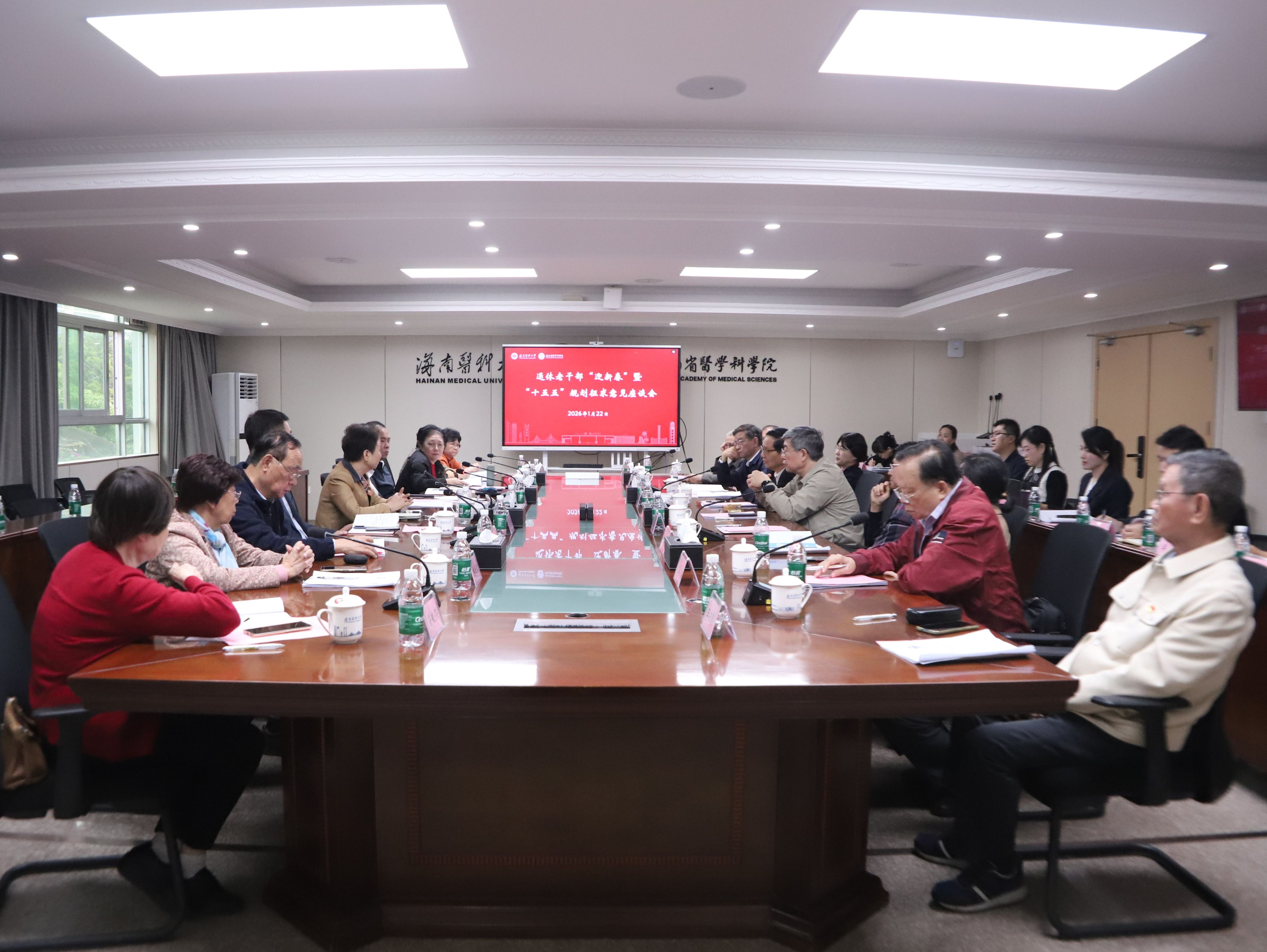 随后,与会老干部、老专家围绕“十五五”规划内容热烈讨论、踊跃建言。大家纷纷表示,过去两年来学校的发展日新月异,肉眼可见,作为在海医长期工作的老同志感到非常欣慰和振奋,期待学校继续保持定力,实现更大的发展。原校长焦解歌教授建议要进一步对标2026年全国教育工作会议精神,加强思想政治教育工作,更加突出从教学型大学向教学研究型大学转型的战略定位;原副校长曾渝教授提出应以更大的力度和举措,推动药学等学科与生物医药产业深度对接,探索校企合作新路径;第二附属医院原党委书记王毅教授认为学校应立足海南自贸港建设,主动谋划承接“来华就医”和“海外办医”等国际医疗任务;93岁高龄的附属海南医院原放射科主任王兆熊教授动情地分享了见证学校成功更名为医科大学的喜悦,希望进一步发挥学校优势,整合附属医院资源,深化附属医院改革,使之与学校发展同步,提升医疗和学科发展能级。